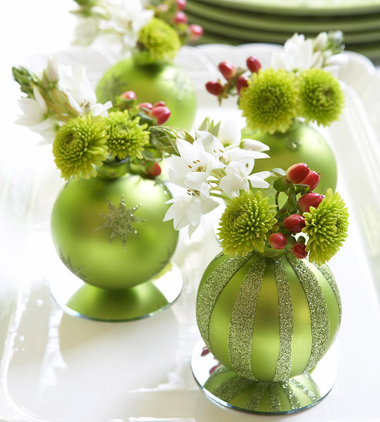 Блестящите коледни топки са идеални за декориране на малки пространства. Залепете топката на малък пластмасов или стъклен диск. Извадете от топката куката за закачване и поставете на нейно място малки цветчета и плодове. Направете красива композиция от тези топки и я поставете на масата.